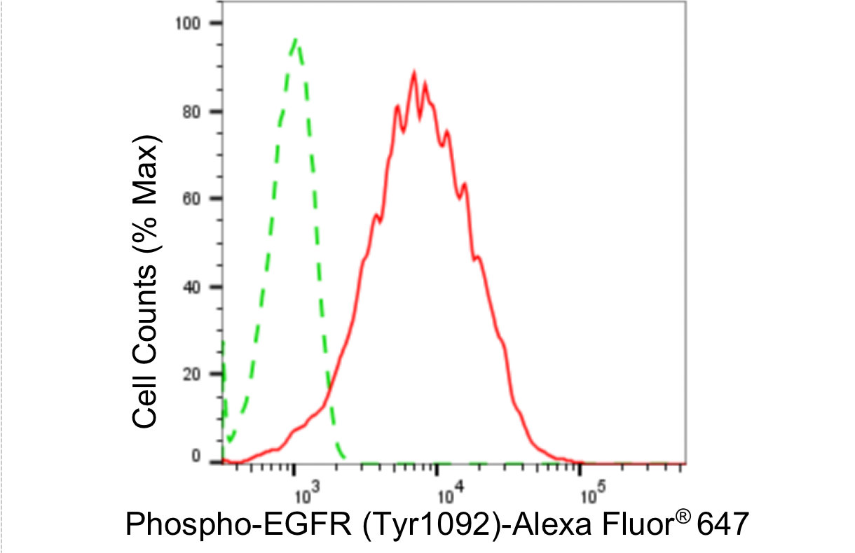 Flow cytometric analysis of phospho-EGFR (Tyr1092) expression in HepG2 cells using phospho-EGFR (Tyr1092) antibody. Green, isotype control; red, phospho-EGFR (Tyr1092).