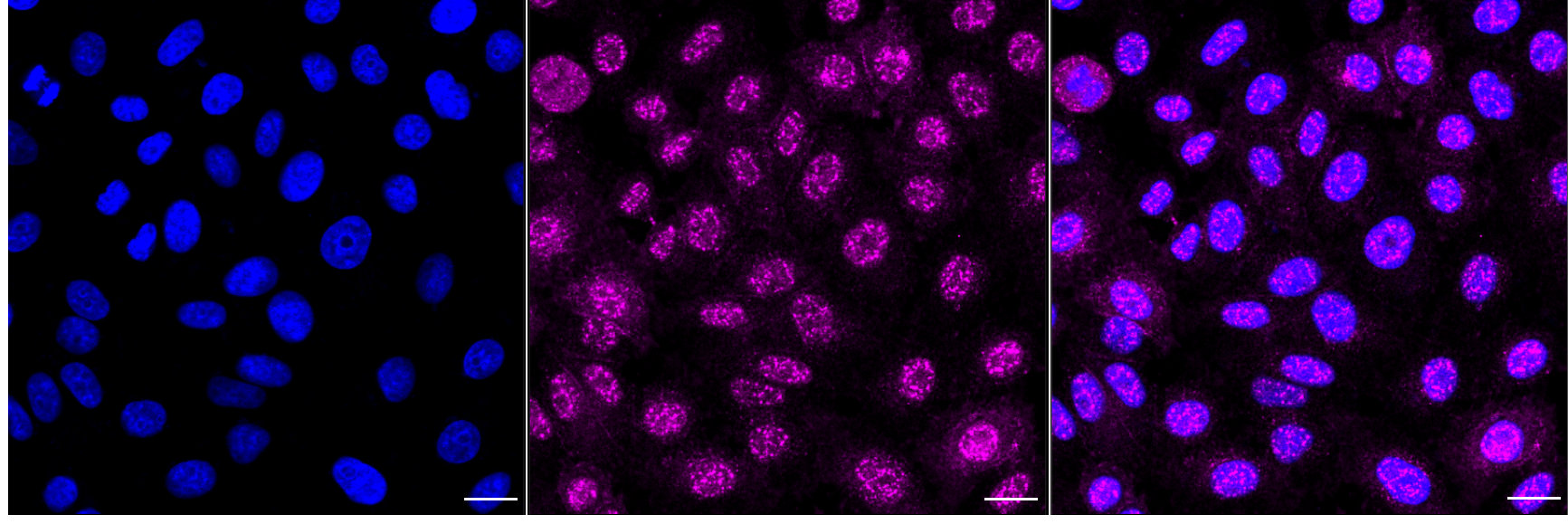 Immunocytochemical staining of HepG2 cells with Phospho-EGFR (Tyr1092) antibody. Nuclei were stained blue with DAPI; Phospho-EGFR (Tyr1092) was stained magenta with Alexa Fluor? 647. Images were taken using Leica stellaris 5. Protein abundance based on laser Intensity and smart gain: Medium. Scale bar, 20 μm.