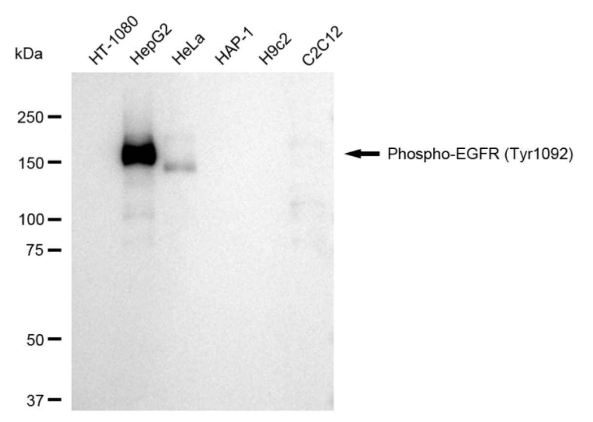 Western blotting analysis using phospho-EGFR (Tyr1092) antibody. Total cell lysates (30 μg) from various cell lines were loaded and separated by SDS-PAGE. The blot was incubated with phospho-EGFR (Tyr1092) antibody and HRP-conjugated goat anti-rabbit secondary antibody respectively.