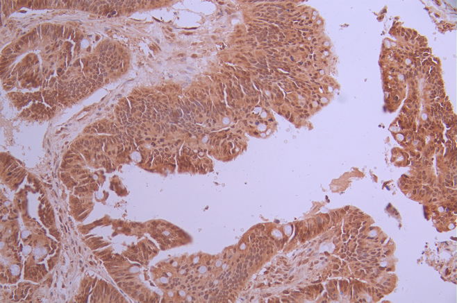 IHC image of CSB-RA056037A0HU diluted at 1:100 and staining in paraffin-embedded human colorectal cancer performed on a Leica BondTM system. After dewaxing and hydration, antigen retrieval was mediated by high pressure in a citrate buffer (pH 6.0). Section was blocked with 10% normal goat serum 30min at RT. Then primary antibody (1% BSA) was incubated at 4°C overnight. The primary is detected by a Goat anti-rabbit polymer IgG labeled by HRP and visualized using 0.05% DAB.