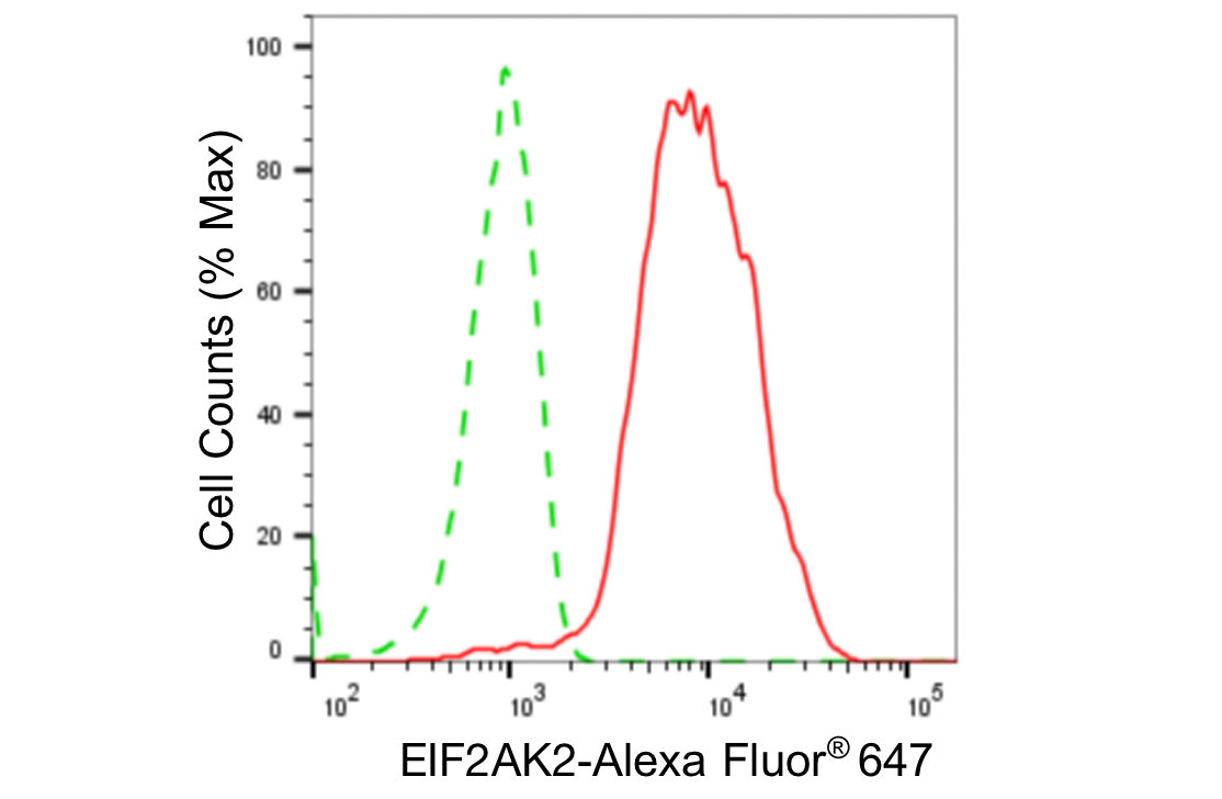 Flow cytometric analysis of EIF2AK2 expression in HepG2 cells using EIF2AK2 antibody. Green, isotype control; red,EIF2AK2.
