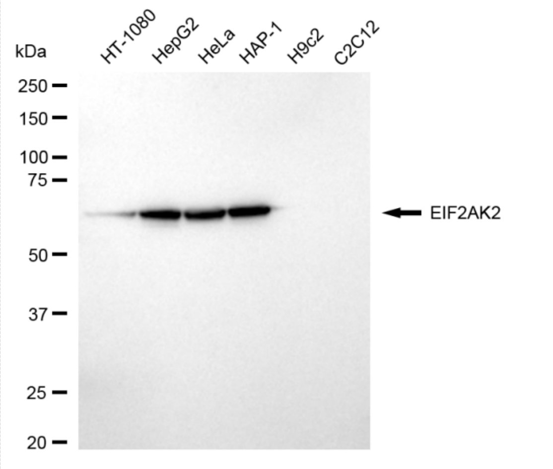 Western blotting analysis using EIF2AK2 antibody. Total cell lysates (30 μg) from various cell lines were loaded and separated by SDS-PAGE. The blot was incubated with EIF2AK2 antibody and HRP-conjugated goat anti-rabbit secondary antibody respectively. EIF2AK2, eukaryotic translation initiation factor 2 alpha kinase 2.