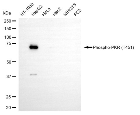 Western blotting analysis using phospho-phospho PKR(T451) antibody. Total cell lysates (30 μg) from various cell lines were loaded and separated by SDS-PAGE. The blot was incubated with phospho-phospho PKR(T451) antibody and HRP-conjugated goat anti-rabbit secondary antibody respectively.