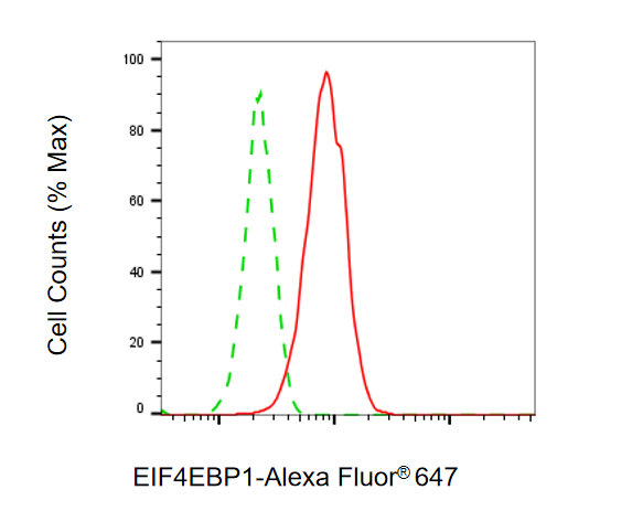 Flow cytometric analysis of EIF4EBP1 expression in HAP-1 cells using EIF4EBP1 antibody. Green, isotype control; red, EIF4EBP1.