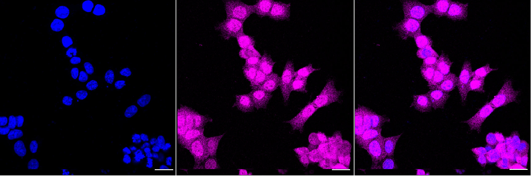 Immunocytochemical staining of HAP-1 cells with EIF4EBP1 antibody. Nuclei were stained blue with DAPI; EIF4EBP1 was stained magenta with Alexa Fluor? 647. Images were taken using Leica stellaris 5. Protein abundance based on laser Intensity and smart gain: Medium. Scale bar, 20 μm.
