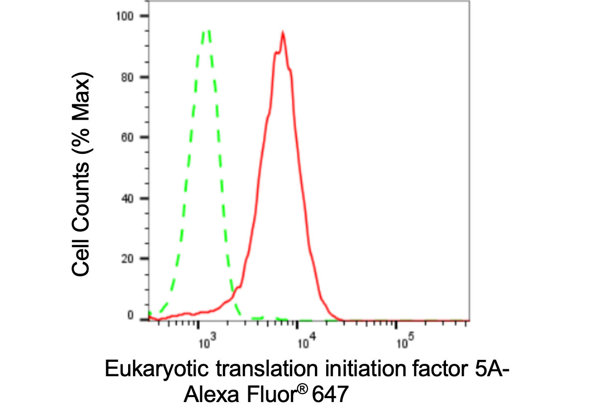 Flow cytometric analysis of Eukaryotic translation initiation factor 5A expression in HepG2 cells using Eukaryotic translation initiation factor 5A antibody. Green, isotype control; red, Eukaryotic translation initiation factor 5A.