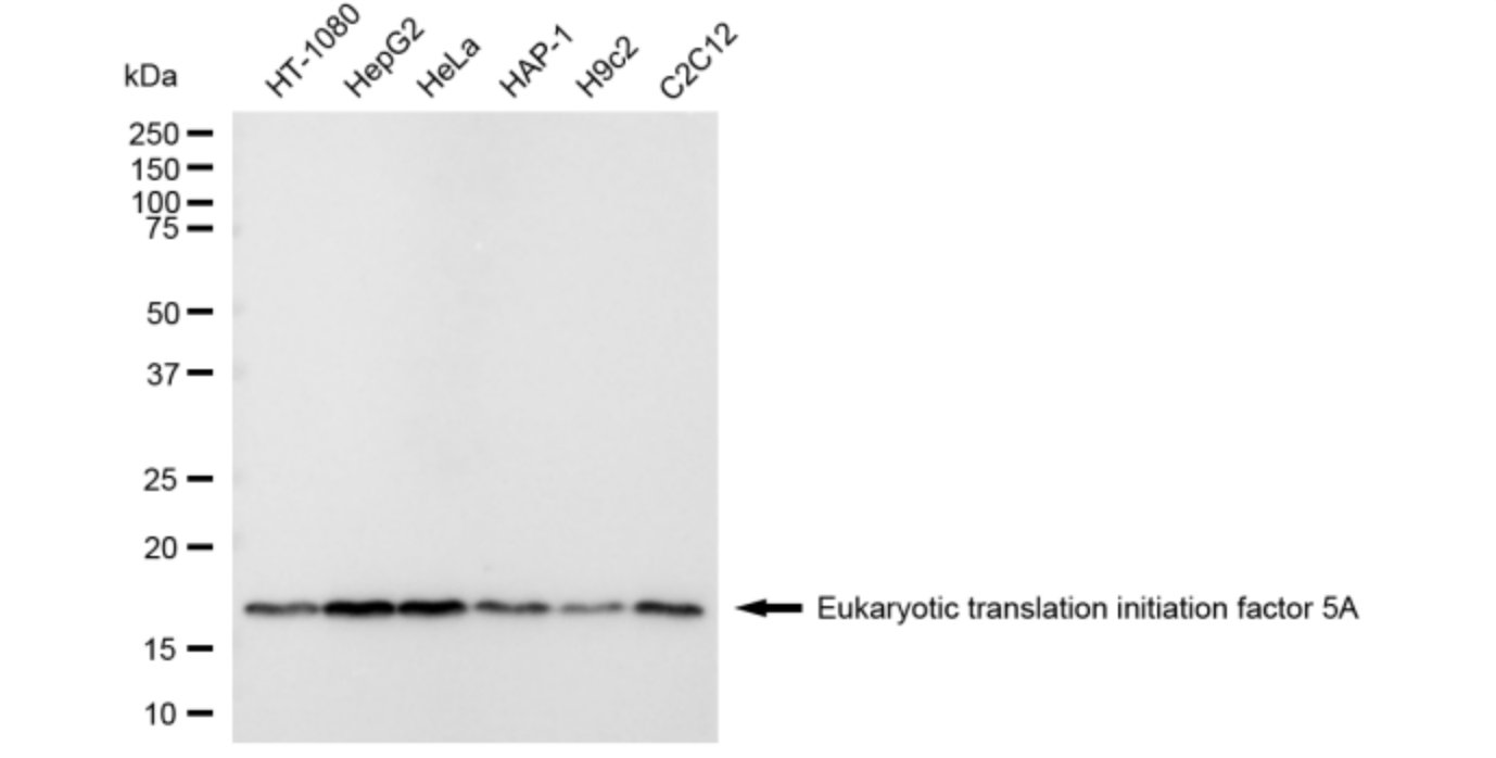 Western blotting analysis using Eukaryotic translation initiation factor 5A antibody. Total cell lysates (30 μg) from various cell lines were loaded and separated by SDS-PAGE. The blot was incubated with Eukaryotic translation initiation factor 5A antibody and HRP-conjugated goat anti-rabbit secondary antibody respectively.