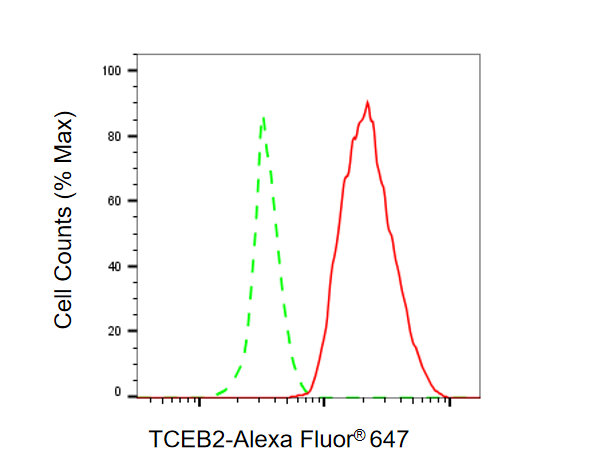 Flow cytometric analysis of TCEB2 expression in Hela cells using TCEB2 antibody. Green, isotype control; red, TCEB2.