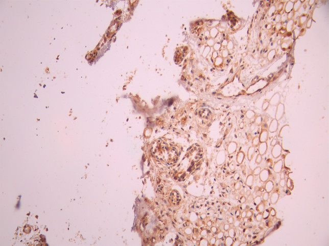 IHC image of CSB-RA122093A0HU diluted at 1:100 and staining in paraffin-embedded human skin tissue performed on a Leica BondTM system. After dewaxing and hydration, antigen retrieval was mediated by high pressure in a citrate buffer (pH 6.0). Section was blocked with 10% normal goat serum 30min at RT. Then primary antibody (1% BSA) was incubated at 4°C overnight. The primary is detected by a Goat anti-rabbit polymer IgG labeled by HRP and visualized using 0.05% DAB.