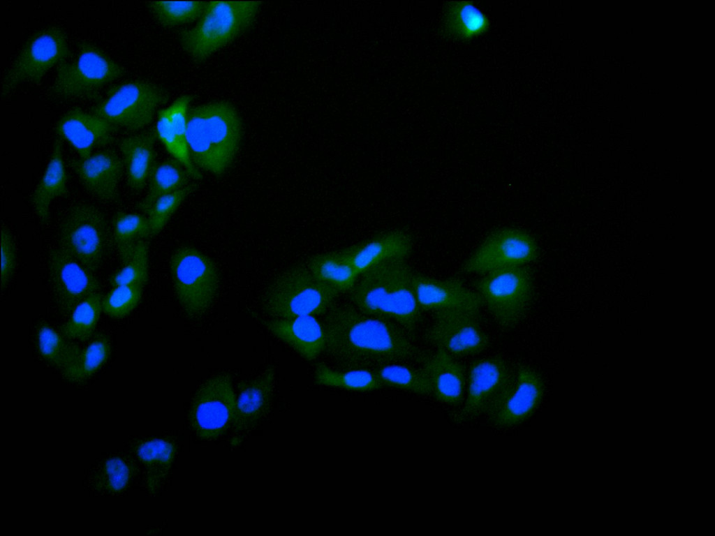 Immunofluorescence staining of HeLa cell with CSB-RA250899A0HU at 1:50 , counter-stained with DAPI. The cells were fixed in 4% formaldehyde, permeabilized using 0.2% Triton X-100 and blocked in 10% normal Goat Serum. The cells were then incubated with the antibody overnight at 4°C. The secondary antibody was Alexa Fluor 488-congugated AffiniPure Goat Anti-Rabbit IgG(H+L).