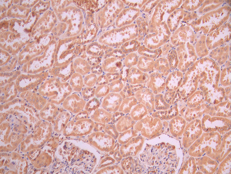IHC image of CSB-RA215137A0HU diluted at 1:100 and staining in paraffin-embedded human kidney tissue performed on a Leica BondTM system. After dewaxing and hydration, antigen retrieval was mediated by high pressure in a citrate buffer (pH 6.0). Section was blocked with 10% normal goat serum 30min at RT. Then primary antibody (1% BSA) was incubated at 4°C overnight. The primary is detected by a Goat anti-rabbit polymer IgG labeled by HRP and visualized using 0.05% DAB.