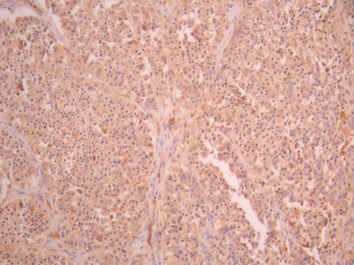IHC image of CSB-RA215137A0HU diluted at 1:100 and staining in paraffin-embedded human liver cancer performed on a Leica BondTM system. After dewaxing and hydration, antigen retrieval was mediated by high pressure in a citrate buffer (pH 6.0). Section was blocked with 10% normal goat serum 30min at RT. Then primary antibody (1% BSA) was incubated at 4°C overnight. The primary is detected by a Goat anti-rabbit polymer IgG labeled by HRP and visualized using 0.05% DAB.