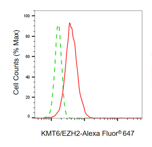 Flow cytometric analysis of KMT6/EZH2 expression in HepG2 cells using KMT6/EZH2 antibody. Green, isotype control; red, KMT6/EZH2.