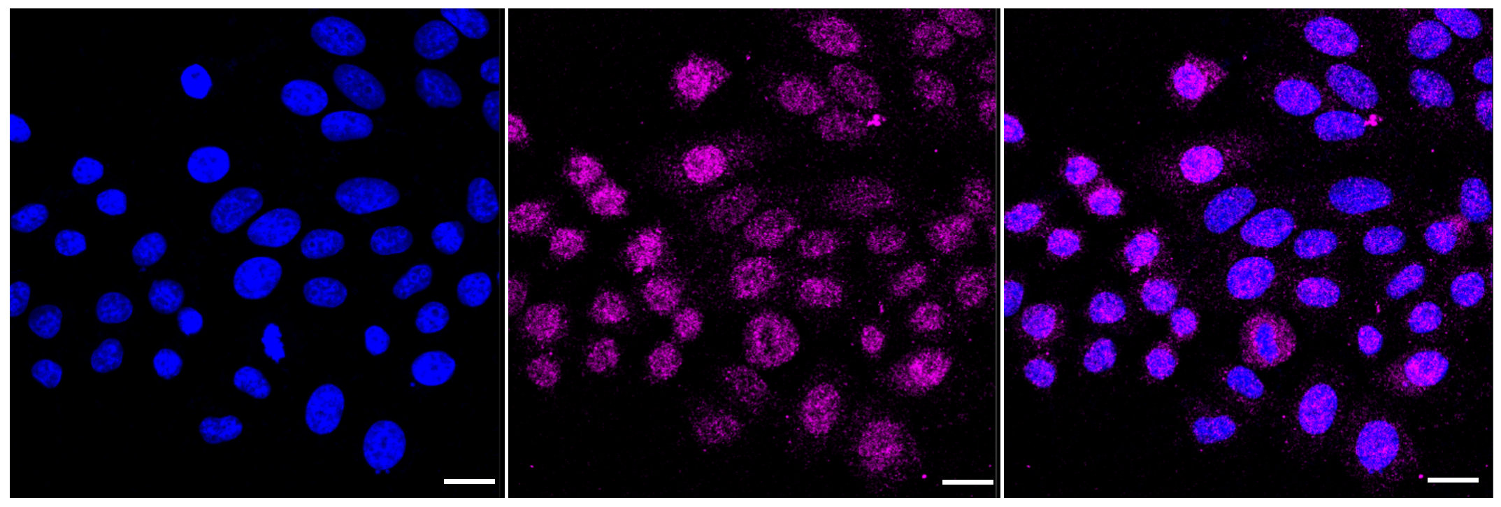 Immunocytochemical staining of HepG2 cells with FANCA antibody. Nuclei were stained blue with DAPI; FANCA was stained magenta with Alexa Fluor? 647. Images were taken using Leica stellaris 5. Protein abundance based on laser Intensity and smart gain: Low. Scale bar, 20 μm.