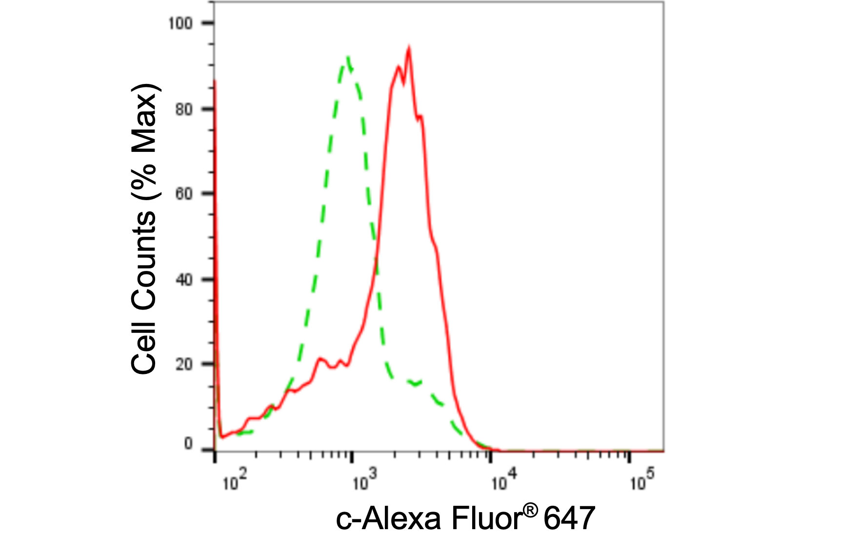 Flow cytometric analysis of Fibroblast growth factor receptor 1 expression in HAP-1 cells using Fibroblast growth factor receptor 1 antibody. Green, isotype control; red, Fibroblast growth factor receptor 1.