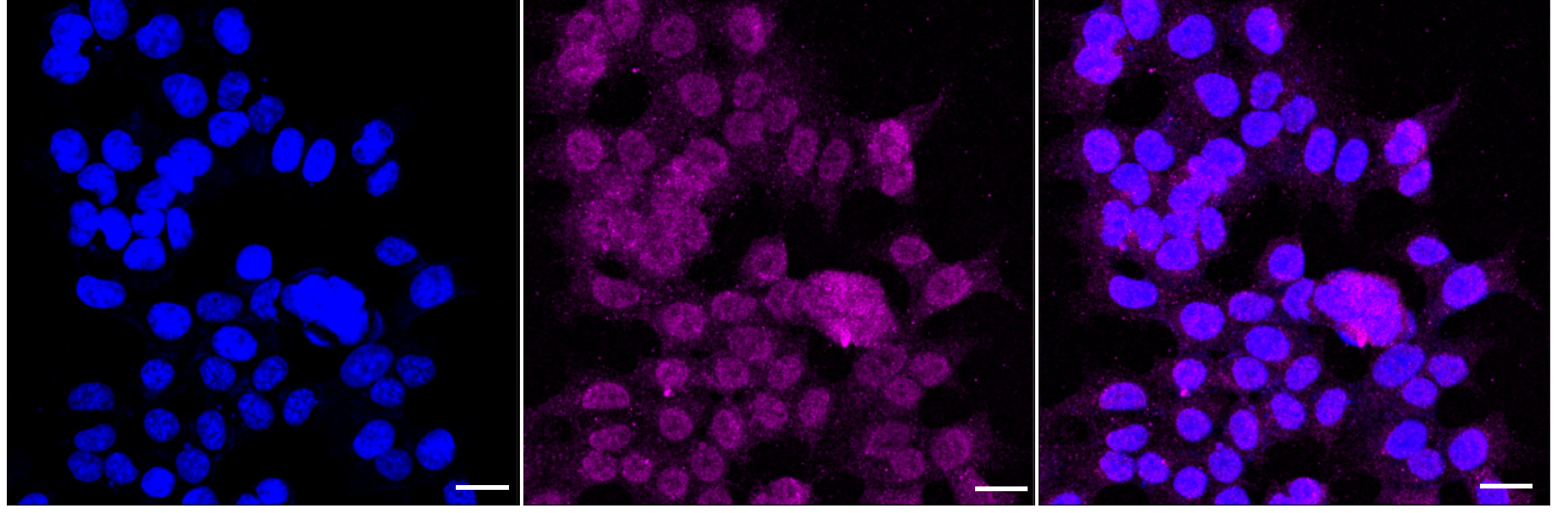 Immunocytochemical staining of HAP-1 cells with Fibroblast growth factor receptor 1 antibody. Nuclei were stained blue with DAPI; Fibroblast growth factor receptor 1 was stained magenta with Alexa Fluor? 647. Images were taken using Leica stellaris 5. Protein abundance based on laser Intensity and smart gain: Medium. Scale bar: 20 μm.