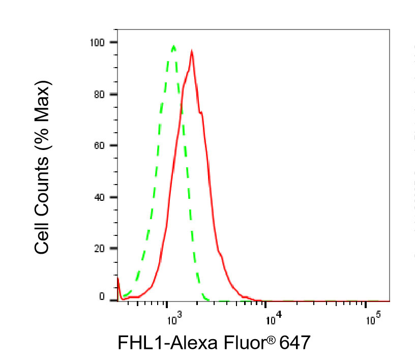Flow cytometric analysis of FHL1 expression in H9c2 cells using FHL1 antibody. Green, isotype control; red, FHL1.
