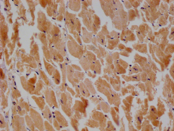 IHC image of CSB-RA334524A0HU diluted at 1:100 and staining in paraffin-embedded human heart tissue performed on a Leica BondTM system. After dewaxing and hydration, antigen retrieval was mediated by high pressure in a citrate buffer (pH 6.0). Section was blocked with 10% normal goat serum 30min at RT. Then primary antibody (1% BSA) was incubated at 4°C overnight. The primary is detected by a Goat anti-rabbit polymer IgG labeled by HRP and visualized using 0.05% DAB.