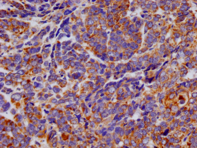 IHC image of CSB-RA334524A0HU diluted at 1:100 and staining in paraffin-embedded human ovarian cancer performed on a Leica BondTM system. After dewaxing and hydration, antigen retrieval was mediated by high pressure in a citrate buffer (pH 6.0). Section was blocked with 10% normal goat serum 30min at RT. Then primary antibody (1% BSA) was incubated at 4°C overnight. The primary is detected by a Goat anti-rabbit polymer IgG labeled by HRP and visualized using 0.05% DAB.