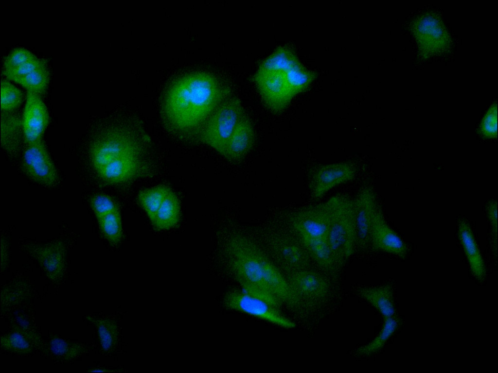 Immunofluorescence staining of MCF-7 cell with CSB-RA121108A0HU at 1:50, counter-stained with DAPI. The cells were fixed in 4% formaldehyde, permeabilized using 0.2% Triton X-100 and blocked in 10% normal Goat Serum. The cells were then incubated with the antibody overnight at 4°C. The secondary antibody was Alexa Fluor 488-congugated AffiniPure Goat Anti-Rabbit IgG(H+L).