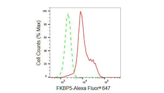 Flow cytometric analysis of FKBP5 expression in HeLa cells using FKBP5 antibody. Green, isotype control; red, FKBP5.