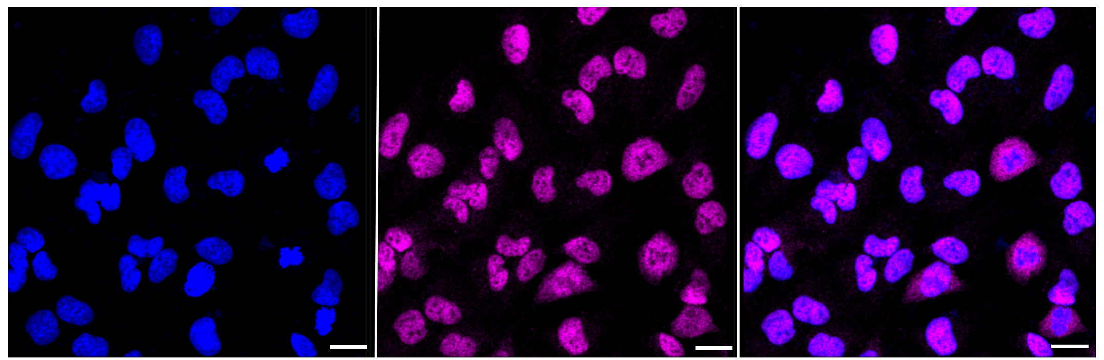 Immunocytochemical staining of Hela cells with FKBP5 antibody. Nuclei were stained blue with DAPI; FKBP5 was stained magenta with Alexa Fluor? 647. Images were taken using Leica stellaris 5. Protein abundance based on laser Intensity and smart gain: Medium. Scale bar: 20 μm.