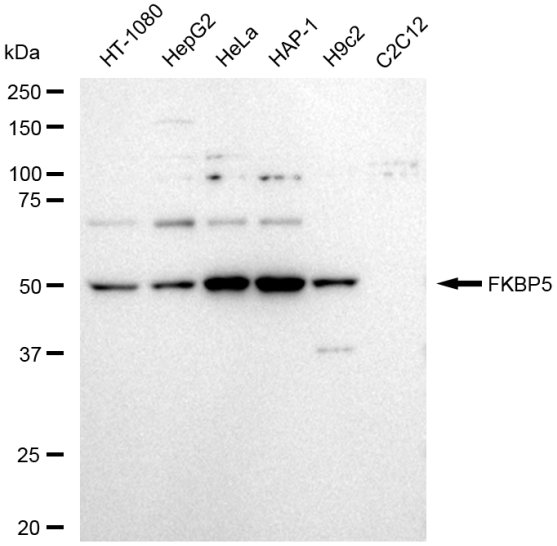 Western blotting analysis using FKBP5 antibody. Total cell lysates (30 μg) from various cell lines were loaded and separated by SDS-PAGE. The blot was incubated with FKBP5 antibody and HRP-conjugated goat anti-rabbit secondary antibody respectively.