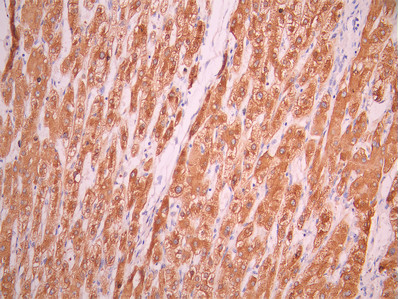 IHC image of CSB-RA144042A0HU diluted at 1:100 and staining in paraffin-embedded human liver tissue performed on a Leica BondTM system. After dewaxing and hydration, antigen retrieval was mediated by high pressure in a citrate buffer (pH 6.0). Section was blocked with 10% normal goat serum 30min at RT. Then primary antibody (1% BSA) was incubated at 4°C overnight. The primary is detected by a Goat anti-rabbit polymer IgG labeled by HRP and visualized using 0.05% DAB.