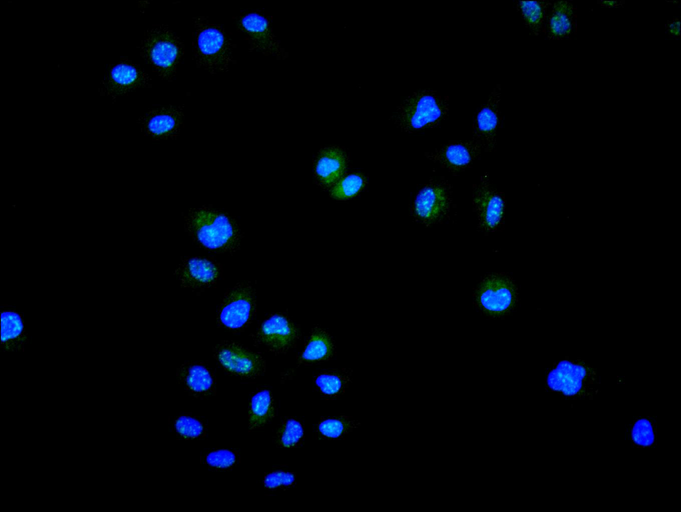 Immunofluorescence staining of Hela cell with CSB-RA797360A0HU at 1:50, counter-stained with DAPI. The cells were fixed in 4% formaldehyde, permeabilized using 0.2% Triton X-100 and blocked in 10% normal Goat Serum. The cells were then incubated with the antibody overnight at 4°C. The secondary antibody was Alexa Fluor 488-congugated AffiniPure Goat Anti-Rabbit IgG(H+L).