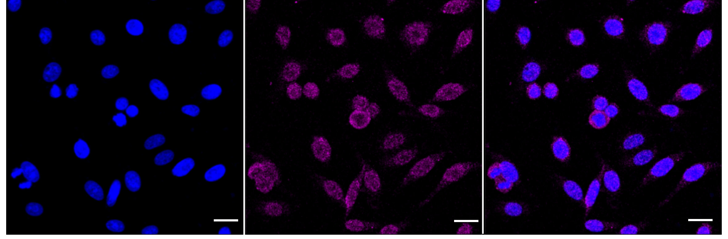 Immunocytochemical staining of HepG2 cells with FTO antibody. Nuclei were stained blue with DAPI; FTO was stained magenta with Alexa Fluor? 647. Images were taken using Leica stellaris 5. Protein abundance based on laser Intensity and smart gain: Low. Scale bar: 20 μm.