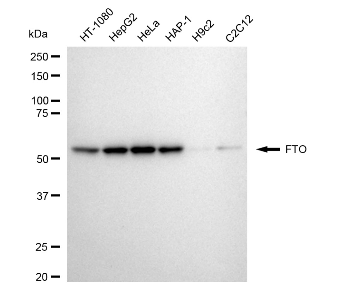 Western blotting analysis using FTO antibody. Total cell lysates (20 μg) from various cell lines were loaded and separated by SDS-PAGE. The blot was incubated with FTO antibody and HRP-conjugated goat anti-rabbit secondary antibody respectively.