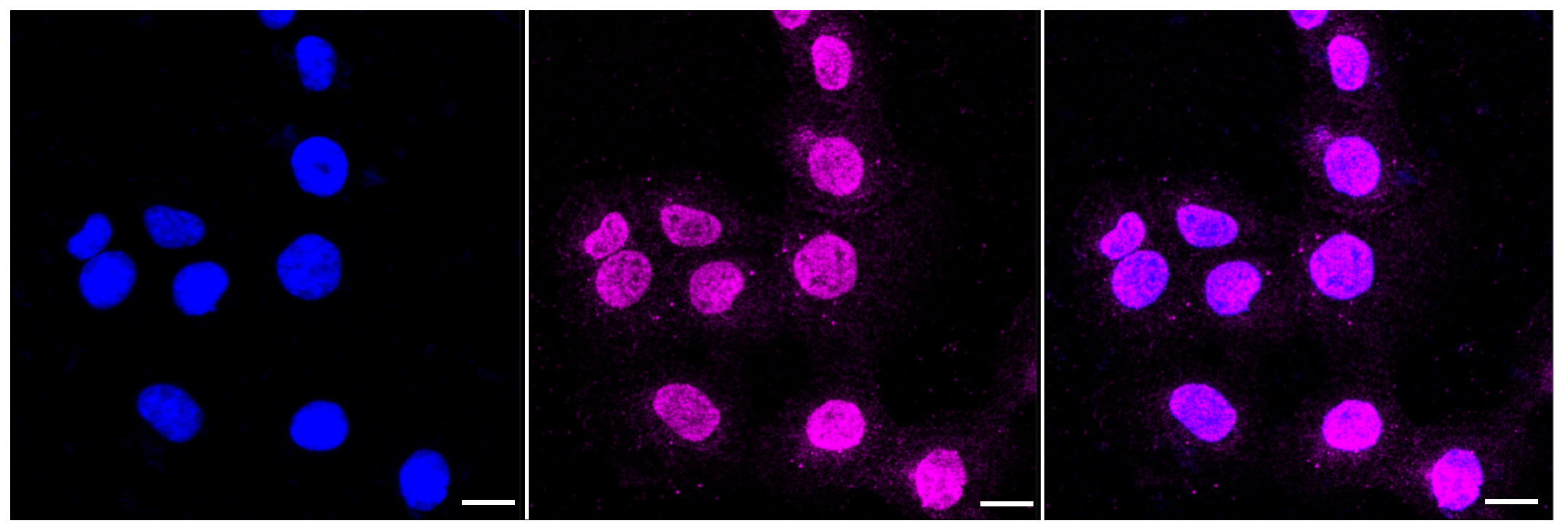 Immunocytochemical staining of HT-1080 cells with Fyn antibody. Nuclei were stained blue with DAPI; Fyn was stained magenta with Alexa Fluor? 647. Images were taken using Leica stellaris 5. Protein abundance based on laser Intensity and smart gain: Medium. Scale bar: 20 μm.