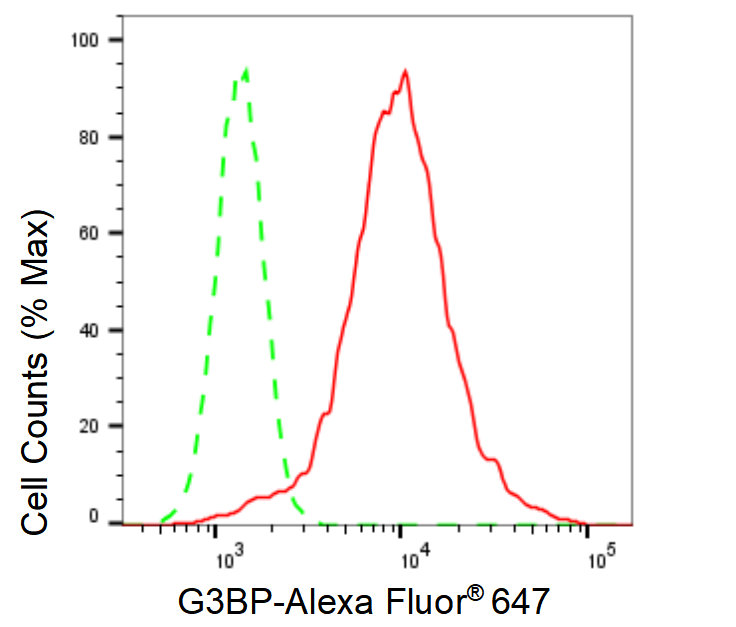 Flow cytometric analysis of G3BP expression in HepG2 cells using G3BP antibody. Green, isotype control; red, G3BP.