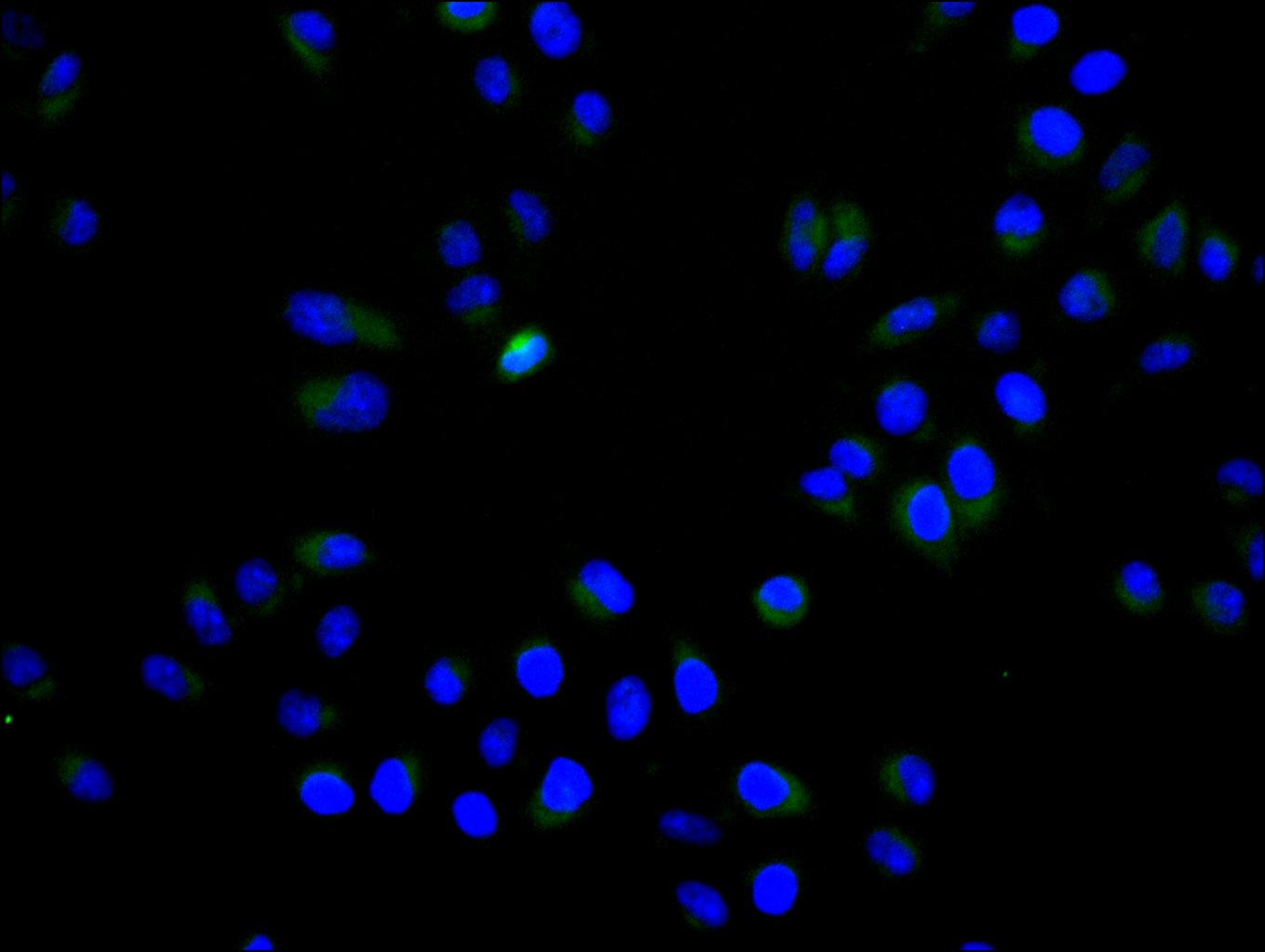 Immunofluorescence staining of Hela cell with CSB-RA269477A0HU at 1:50, counter-stained with DAPI. The cells were fixed in 4% formaldehyde and blocked in 10% normal Goat Serum. The cells were then incubated with the antibody overnight at 4°C. The secondary antibody was Alexa Fluor 488-congugated AffiniPure Goat Anti-Rabbit IgG(H+L).