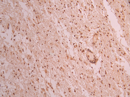 IHC image of CSB-RA256477A0HU diluted at 1:100 and staining in paraffin-embedded human glioma cancer performed on a Leica BondTM system. After dewaxing and hydration, antigen retrieval was mediated by high pressure in a citrate buffer (pH 6.0). Section was blocked with 10% normal goat serum 30min at RT. Then primary antibody (1% BSA) was incubated at 4°C overnight. The primary is detected by a Goat anti-rabbit polymer IgG labeled by HRP and visualized using 0.05% DAB.