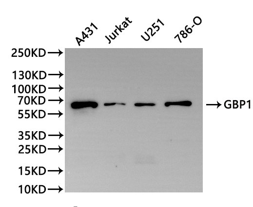 , Positive WB detected in:A431 whole cell lysate(30μg), Jurkat whole cell lysate(30μg), U251 whole cell lysate(30μg), 786-O whole cell lysate(30μg)