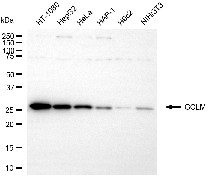 Western blotting analysis using GCLM antibody. Total cell lysates (30 μg) from various cell lines were loaded and separated by SDS-PAGE. The blot was incubated with GCLM antibody and HRP-conjugated goat anti-rabbit secondary antibody respectively.