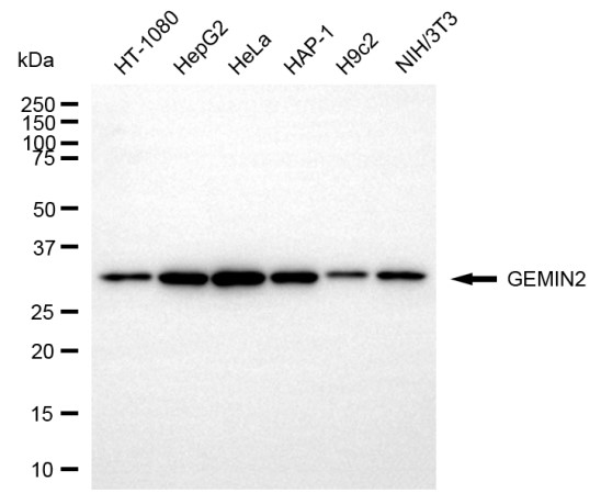 Western blotting analysis using GEMIN2 antibody. Total cell lysates (30 μg) from various cell lines were loaded and separated by SDS-PAGE. The blot was incubated with GEMIN2 antibody and HRP-conjugated goat anti-rabbit secondary antibody respectively.