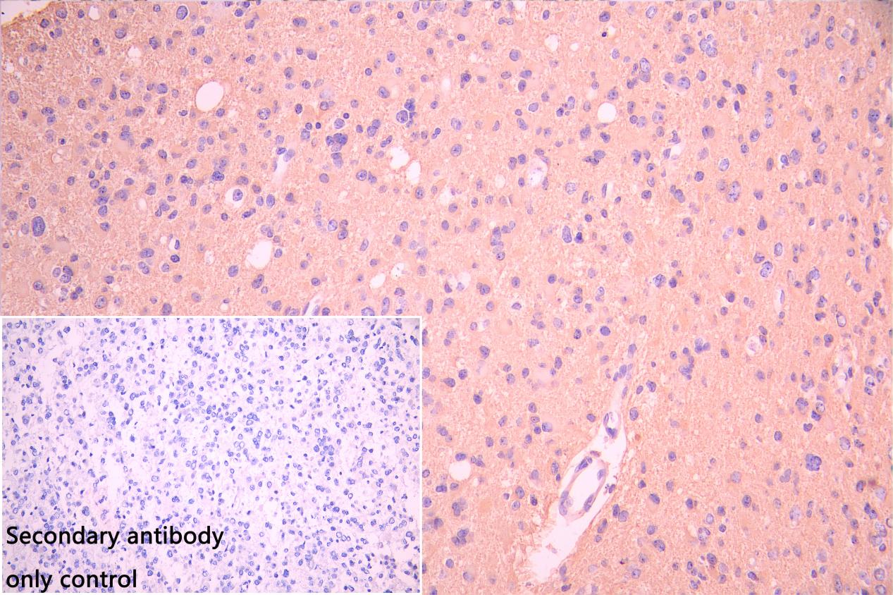 IHC image of CSB-RA009369MA1HU diluted at 1:50 and staining in paraffin-embedded human glioma cancer performed on a Leica BondTM system. After dewaxing and hydration, antigen retrieval was mediated by high pressure in a citrate buffer (pH 6.0). Section was blocked with 10% normal goat serum 30min at RT. Then primary antibody (1% BSA) was incubated at 4°C overnight. The primary is detected by a Goat anti-rabbit polymer IgG labeled by HRP and visualized using 0.05% DAB. Secondary antibody only control: uses 1% BSA instead of primary antibody