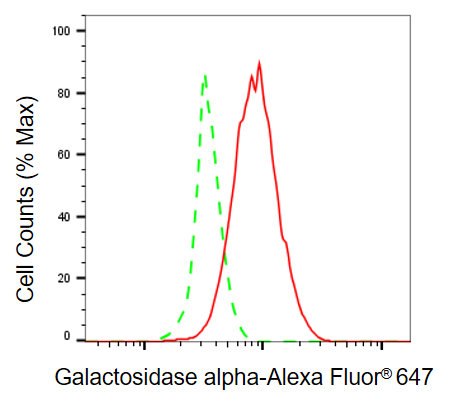 Flow cytometric analysis of galactosidase alpha expression in Hela cells using galactosidase alpha antibody. Green, isotype control; red, galactosidase alpha.