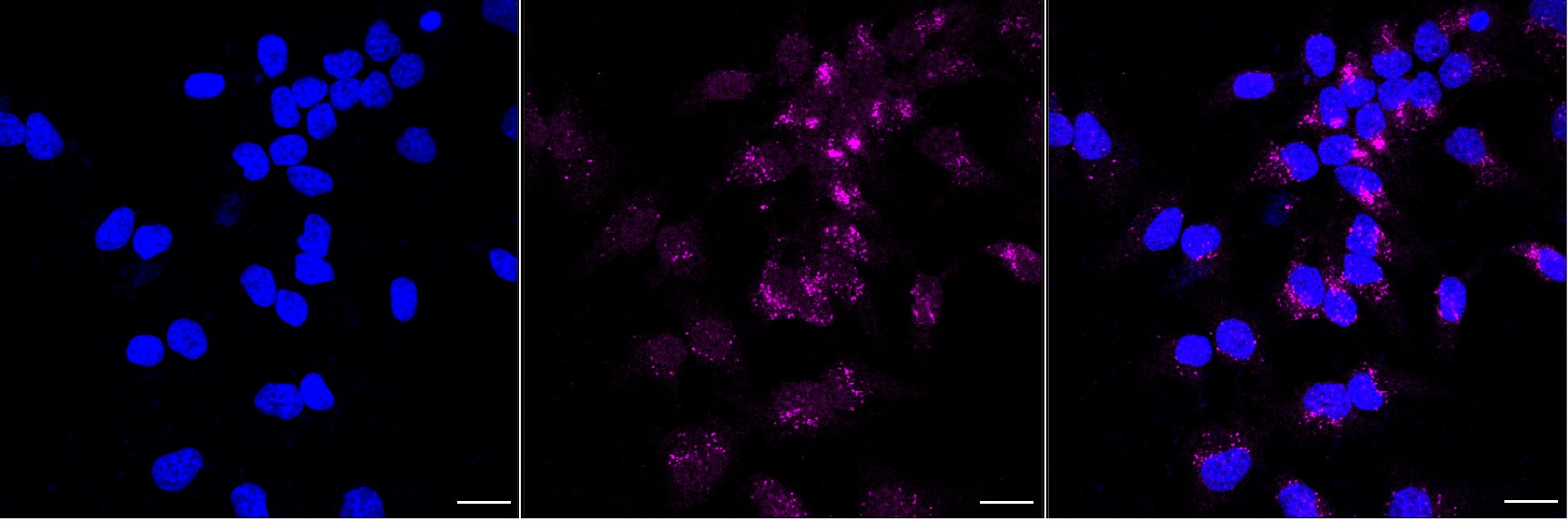 Immunocytochemical staining of Hela cells with Galactosidase alpha antibody. Nuclei were stained blue with DAPI; Galactosidase alpha was stained magenta with Alexa Fluor? 647. Images were taken using Leica stellaris 5. Protein abundance based on laser Intensity and smart gain: Medium. Scale bar, 20 μm.