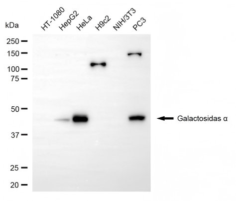 Western blotting analysis using galactosidase alpha antibody. Total cell lysates (30 μg) from various cell lines were loaded and separated by SDS-PAGE. The blot was incubated with galactosidase alpha antibody and HRP-conjugated goat anti-rabbit secondary antibody respectively.