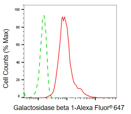 Flow cytometric analysis of galactosidase beta 1 expression in HT-1080 cells using galactosidase beta 1 antibody. Green, isotype control; red, galactosidase beta 1.