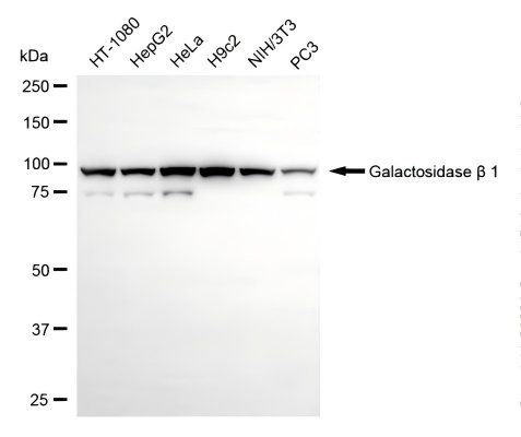 Western blotting analysis using galactosidase β 1 antibody. Total cell lysates (30 μg) from various cell lines were loaded and separated by SDS-PAGE. The blot was incubated with galactosidase β 1 antibody and HRP-conjugated goat anti-rabbit secondary antibody respectively.