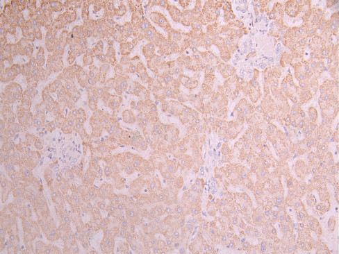 IHC image of CSB-RA938641A0HU diluted at 1:100 and staining in paraffin-embedded human liver cancer performed on a Leica BondTM system. After dewaxing and hydration, antigen retrieval was mediated by high pressure in a citrate buffer (pH 6.0). Section was blocked with 10% normal goat serum 30min at RT. Then primary antibody (1% BSA) was incubated at 4°C overnight. The primary is detected by a Goat anti-rabbit polymer IgG labeled by HRP and visualized using 0.05% DAB.