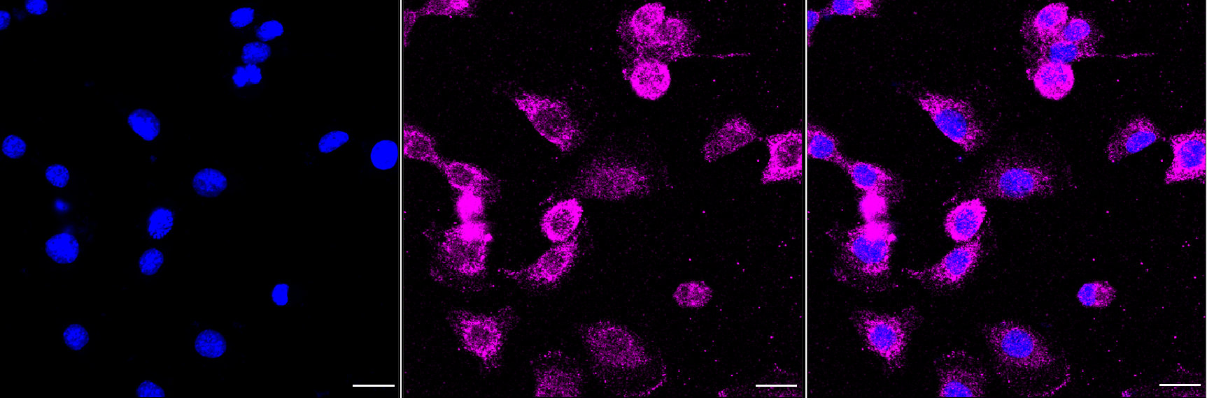 Immunocytochemical staining of C2C12 cells with G protein subunit alpha q antibody. Nuclei were stained blue with DAPI; G protein subunit alpha q was stained magenta with Alexa Fluor? 647. Images were taken using Leica stellaris 5. Protein abundance based on laser Intensity and smart gain: Medium. Scale bar, 20 μm.