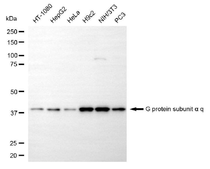 Western blotting analysis using G protein subunit alpha q antibody. Total cell lysates (30 μg) from various cell lines were loaded and separated by SDS-PAGE. The blot was incubated with G protein subunit alpha q antibody and HRP-conjugated goat anti-rabbit secondary antibody respectively.