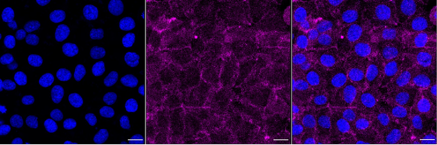 Immunocytochemical staining of HT-1080 cells with G protein subunit beta 2 antibody. Nuclei were stained blue with DAPI; G protein subunit beta 2 was stained magenta with Alexa Fluor? 647. Images were taken using Leica stellaris 5. Protein abundance based on laser Intensity and smart gain: Medium. Scale bar, 20 μm.