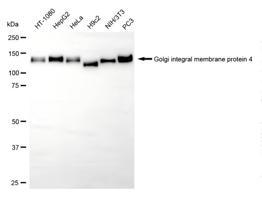 Western blotting analysis using golgi integral membrane protein 4 antibody. Total cell lysates (30 μg) from various cell lines were loaded and separated by SDS-PAGE. The blot was incubated with golgi integral membrane protein 4 antibody and HRP-conjugated goat anti-rabbit secondary antibody respectively.