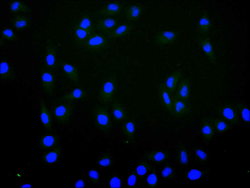 Immunofluorescence staining of Hela cell with CSB-RA020519MA1HU at 1:30 ,counter-stained with DAPI. The cells were fixed in 4% formaldehyde, permeabilized using 0.2% Triton X-100 and blocked in 10% normal Goat Serum. The cells were then incubated with the antibody overnight at 4°C. The secondary antibody was Fluorescein (FITC) AffiniPure Goat Anti-Human IgG, Fcγ fragment specific.